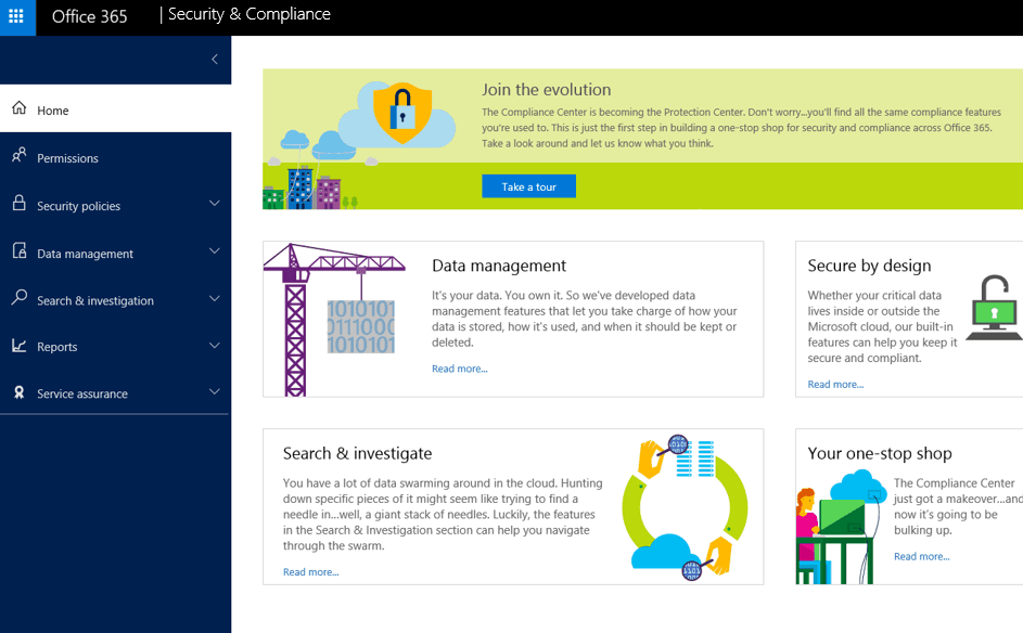 The Office 365 Security & Compliance Center manages compliance across Office 365. It enables you to manage archive mailboxes, establish eDiscovery cases, examine auditing reports, and set retention and deletion policies within Exchange Online, OneDrive, and SharePoint Online. You can also grant compliance managers in your organization access to part or all of the compliance tools included in the Security & Compliance Center by permitting them.